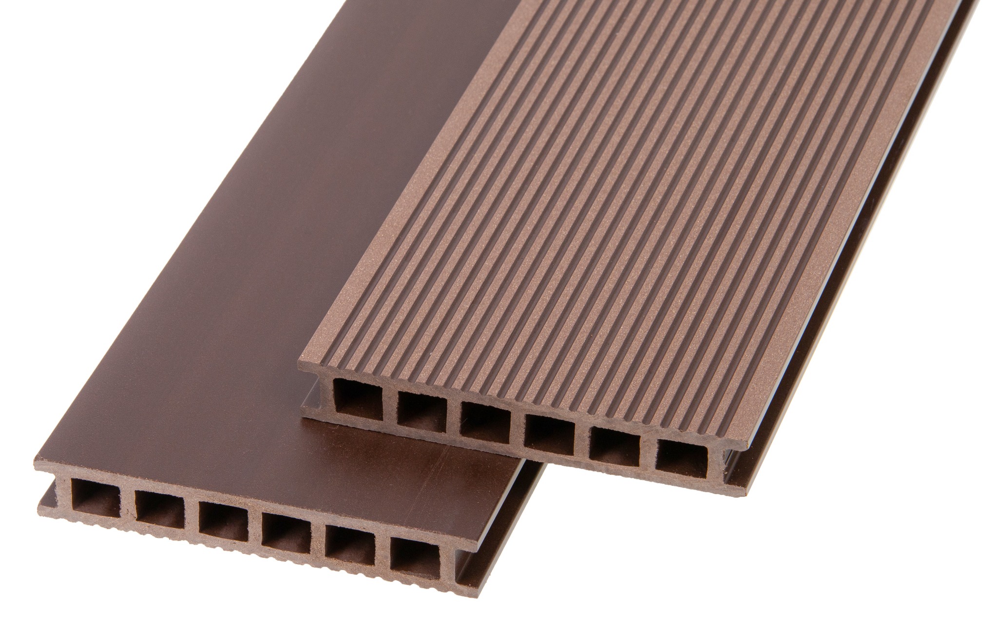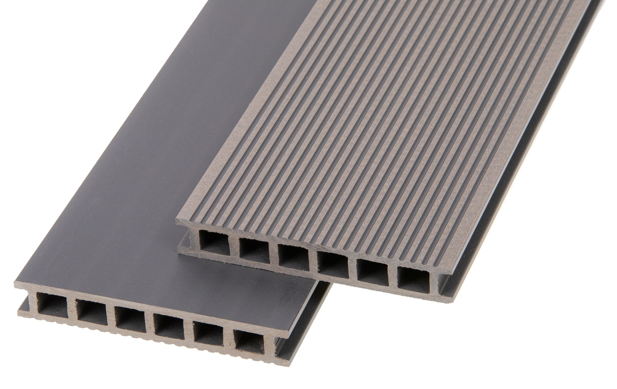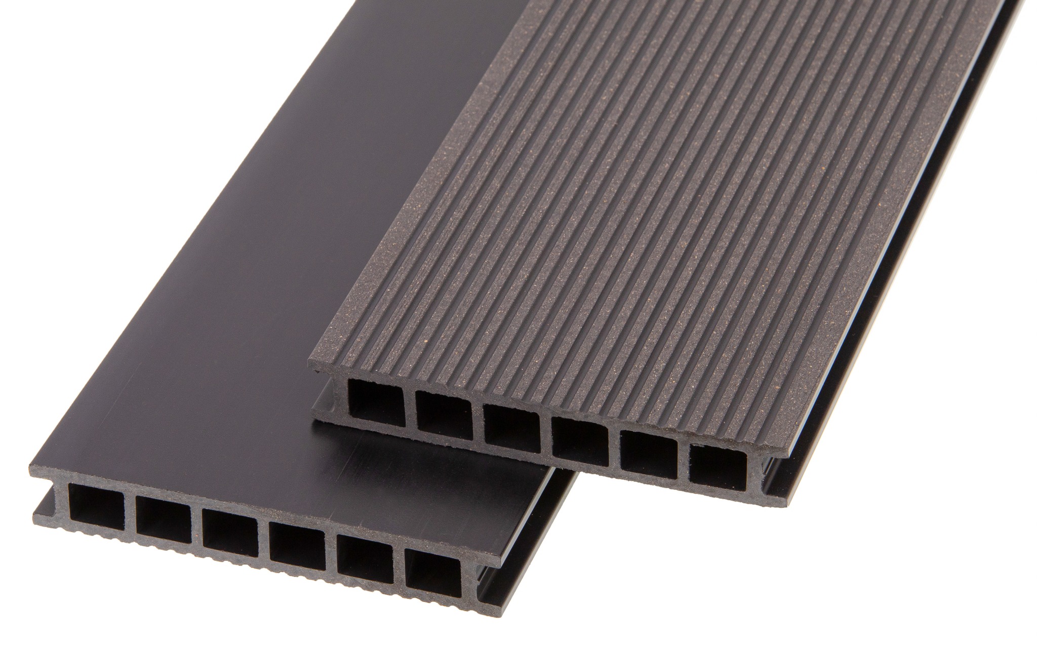 Deski tarasowe ProDeck produkowane są w technologii wytłaczania. Doskonale widać to w przekroju: każdą deskę tworzy jednolity materiał o tym samym kolorze.