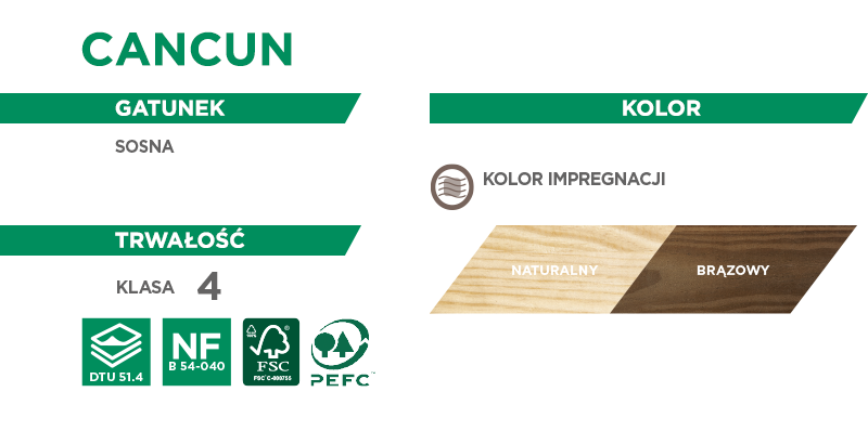 Impregnacja ciśnieniowa nie zmienia właściwości mechanicznych desek Cancun. Po obróbce pozostają zgodne z oznakowaniem CE, co potwierdza ich przeznaczenie do konstrukcji zewnętrznych mających kontakt z gruntem i/lub wodą. Deski posiadają pióro-wpust i montuje się je przy użyciu wkrętów ze stali nierdzewnej.